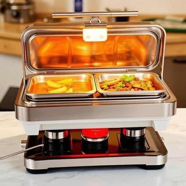 - Chafing Dishes: The classic buffet food warmer. They use water pans (aka bains-marie) heated by disposable fuel cans (Sterno) or electric elements. They are portable and elegant.