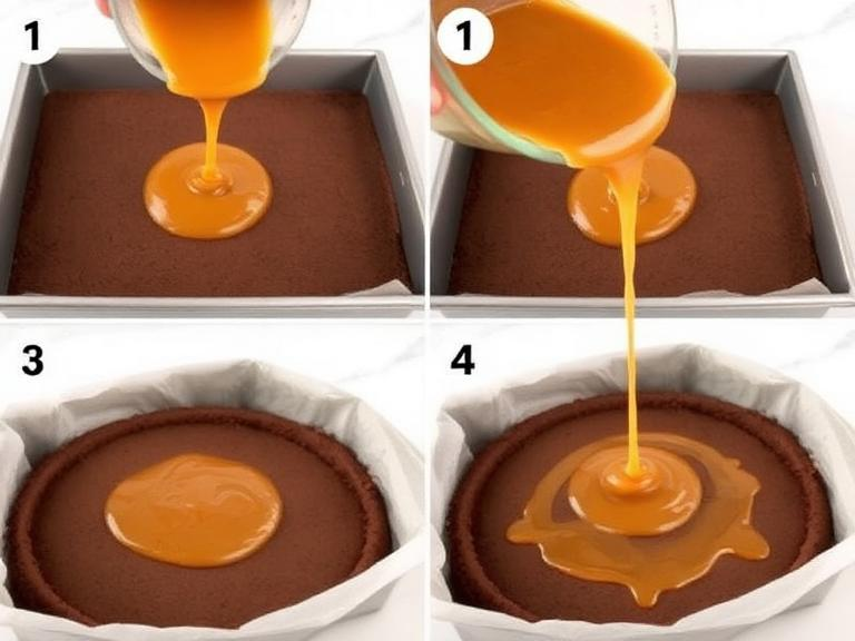 Pour the hot caramel filling over the warm chocolate crust. Spread it out evenly with your spatula, ensuring it reaches all the corners. This hot filling on a warm crust helps prevent the layers from separating later.