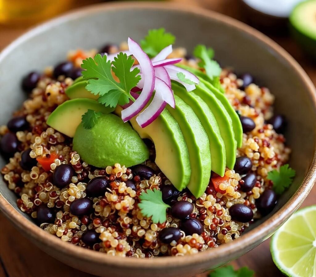 - Ingredients: 1 cup cooked quinoa, 1/2 cup black beans, 1/4 cup corn, diced avocado, salsa, lime wedge.