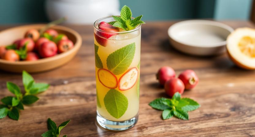 - Stir gently and garnish with a mint sprig and a whole litchi.