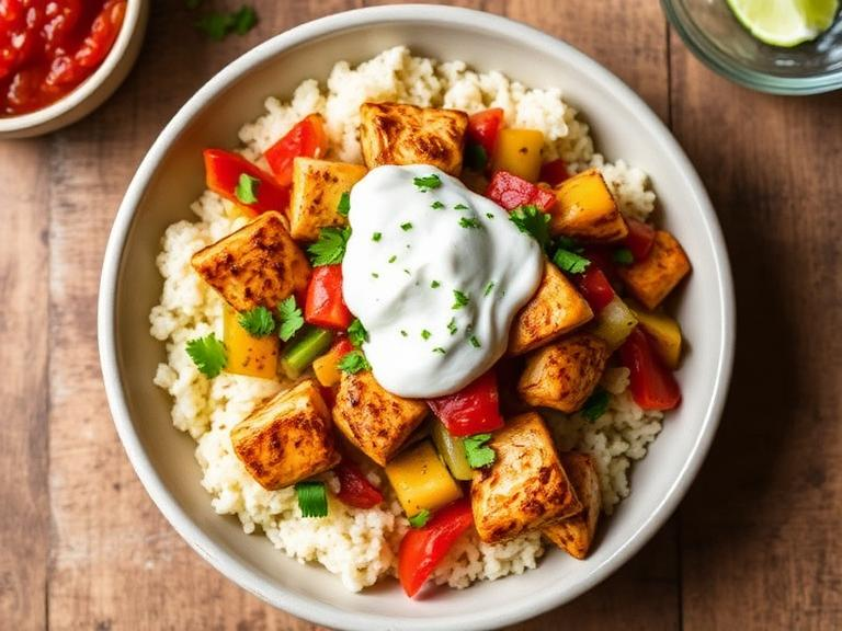 Seasoned chicken breast strips with sautéed bell peppers and onions served over cauliflower rice. Top with salsa, Greek yogurt, and a small amount of cheese.