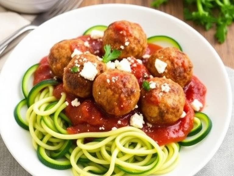 Lean turkey meatballs seasoned with Mediterranean spices, served over spiralized zucchini with marinara sauce and a sprinkle of feta cheese.