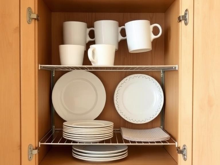 Most standard kitchen cabinets leave significant vertical space unused. If you have tall cabinets but short stacks of plates, you are losing valuable real estate. One of the simplest yet most effective kitchen storage ideas is using shelf risers.