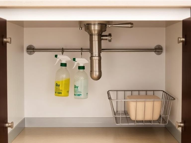 Additionally, use a tension rod near the top of the cabinet to hang spray bottles. This frees up cabinet floor space for a small trash can or a basket of sponges. Keeping this area organized is crucial for spotting leaks early, which can save you from costly plumbing repairs over time.